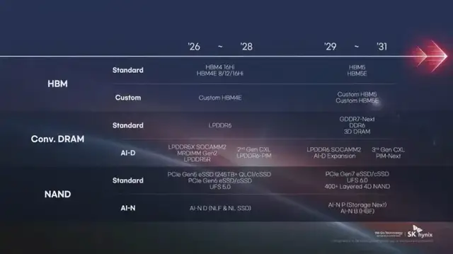 SK 海力士的野心:AI在最近自家举行的SKAI Summit 2025峰会上,SK海力士CEO郭鲁正宣布了新的战略愿景:“全线AI存储创造者”。并且给出了非常详细的产品路线图,涵盖了从2026年至2031年的时间跨度。